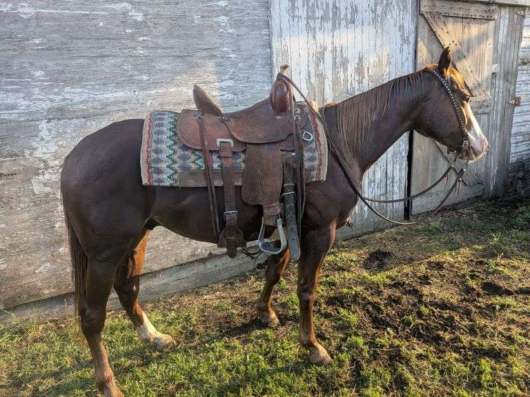 Casper, a 5 year old grade bay Quarter Horse/Welsh crossbred size Pony gelding. Stands approx. 13 hands. Big enough for the kids or adults. The perfect size and good broke to ride. He is gentle and quiet. He was broke to ride at the age of 2 by an 11 year old girl. He has been used in fun shows and play days. He has been used for trails and cattle work. He is very sane and quiet. No vices or funny tricks. He is easy to ride and will go where you point him. He will cross water, go up and down the hills, goes where you point him with ease. Ready to go in any direction. Just needs a little more riding to make him extremely well broke. He is the right size and kind. 100% sound. Come check him out the day of sale!!
