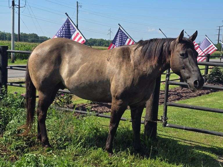 Trigger is a 13 year old Grullo Quarter Horse Gelding that stands 15.0 HH. He is traffic broke and is broke to ride and has been on the trails. He neck reins and lopes circles. Trigger has been ridden in the Colorado mountains moving cattle. He is a nice big, stout, handy gelding. He shoes without a stock.