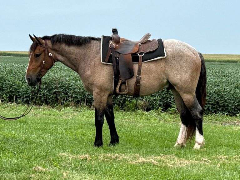 Shorty is a 3 year old strawberry roan Percheron/Quarter horse gelding. Stands approx. 15.3 hands. Shorty rides and drives single and double, either side, traffic broke, side passes, lopes nice circles, neck reins. Quiet and gentle, 13 year old Amish girl has been riding him, has been through woods and water and over logs. 100% sound