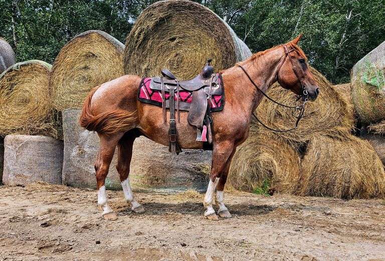 Rooster is a Red Roan Quarter Horse Gelding with a Strip and 4 White Socks. Stands approx. 15.0 hands. Very well broke to ride. Has been on a ranch. We have been trail riding and leading colts. Has been on Jackpot team roping on heading side.