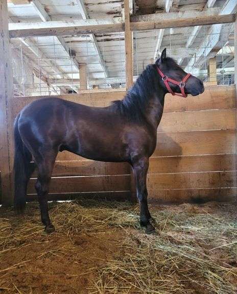 Bandit, a grade 1 year old black Shetland Pony gelding. Stands approx 42". Foaled April 15, 2024. Halter broke.