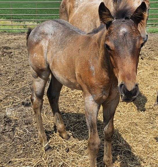 Grady, a weanling bay roan Quarter Pony. Should mature to approx 13.1 hands. He will surely be an eye appealing pony. This cross has consistently produced smart, eager to please foals that are ideal for both children and adults. He should be big enough for an adult to train for a child to ride. He is cow bred with Peppy San Badger Blue Valentine sire. Eligible for registration in the Quarter Pony registry.