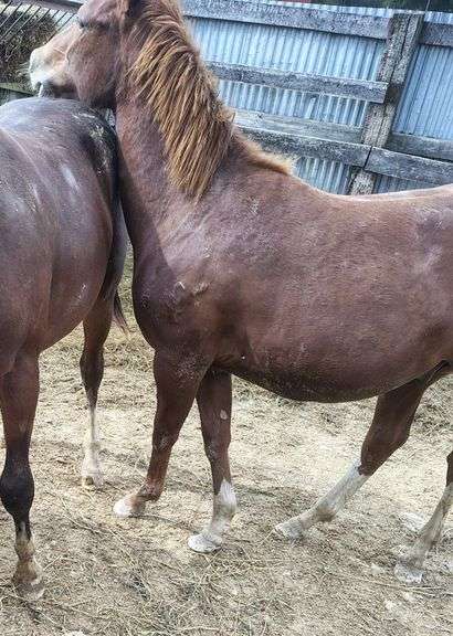 A grade sorrel Quarter Horse yearling gelding. Halter broke.