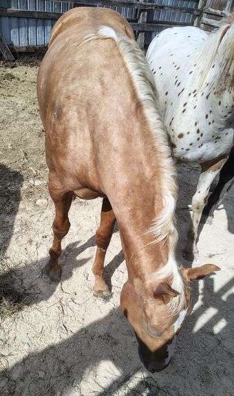 May, a grade 2 year old palomino Quarter Horse mare. Open. Halter broke. A nice shapey mare.