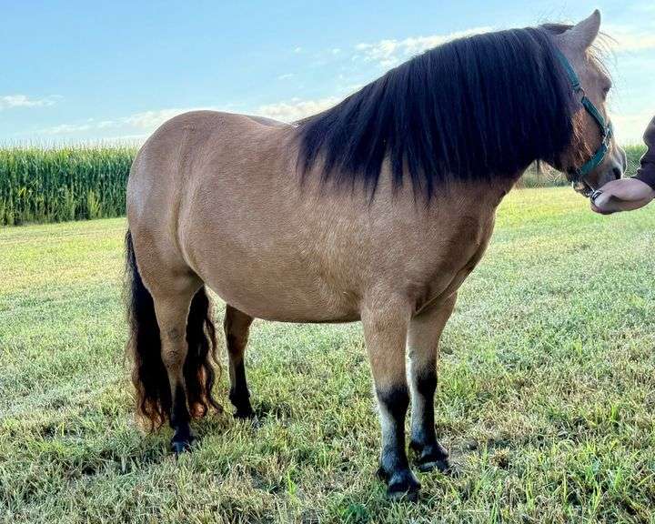 Blue Diamonds Perfect Patch of Lace, is a 11 year old Miniature pony, Buckskin, standing 36" tall. Lacey drives single, rides, and is traffic broke. She loads, bathes, clips, shoes, and ties easily. We are selling her so our children can get a bigger pony.