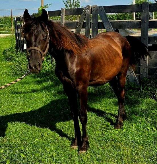 Penny’s Little Shotgun Fan Draco Aka “Gunner”, a smokey black yearling Friesian cross gelding. Stands approx 13 hands. Foaled June 30, 2024. Sired by Draco standing approx 15.2 hands FHH Reg 5036-2009. Dam is a grade red roan pony standing approx 13.2 hands. Gunner is halter broke, loads, and has basic foundation work done. He has great movement, he’s going to be great fun. He is quite spunky, but very intelligent. Would make a really nice flashy cart horse.