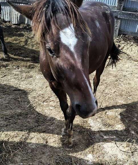 A bay Quarter Horse yearling stallion colt with a stripe and 4 white socks. Halter broke. Very sharp colt.