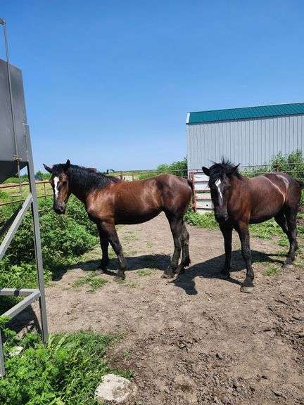 Black Prairie Nova's Alexa and Black Prairie Nova's Ann are a team of black, with strips, two year old registered Percheron mares, standing 17.0 HH. They are well started to drive by Eli J. Bontrager and will be traffic broke. They are a nice and quiet. These two will make someone a good team.